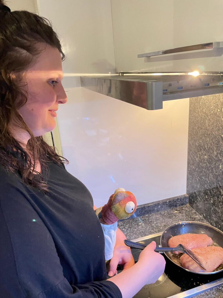We hebben onze leerkrachten uitgenodigd om bij ons te komen eten. Eirikke heeft pasta met kip gemaakt. Ze heeft er een naam aan gegeven: “Gallina”.