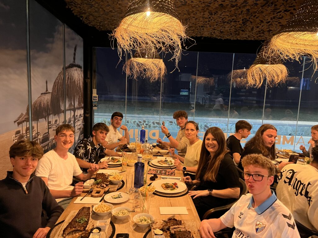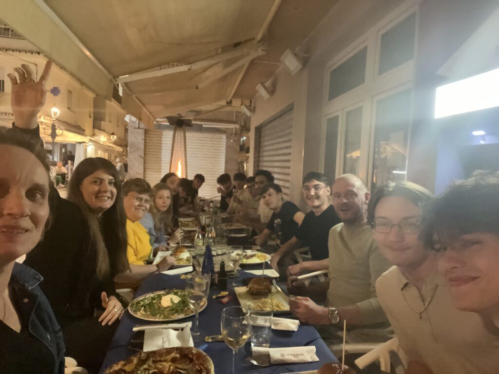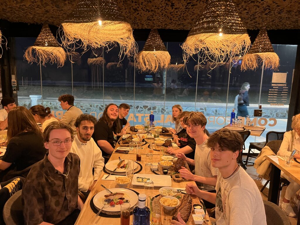De laatste vrijdag hadden de leerlingen vrijaf, zo konden we samen de periode afsluiten. We spraken in de namiddag af op het strand, we trakteerden iedereen op een drankje, er werd gevoetbald en we voerden een opdracht, menselijk alfabet uit. Ook vrijdag werden de leerlingen terug getrakteerd op een gezellig diner in ‘ZeroZero’. Grote porties ribben werden massaal verorberd, ook de lokale en minder lokale vis werd er gesmaakt.