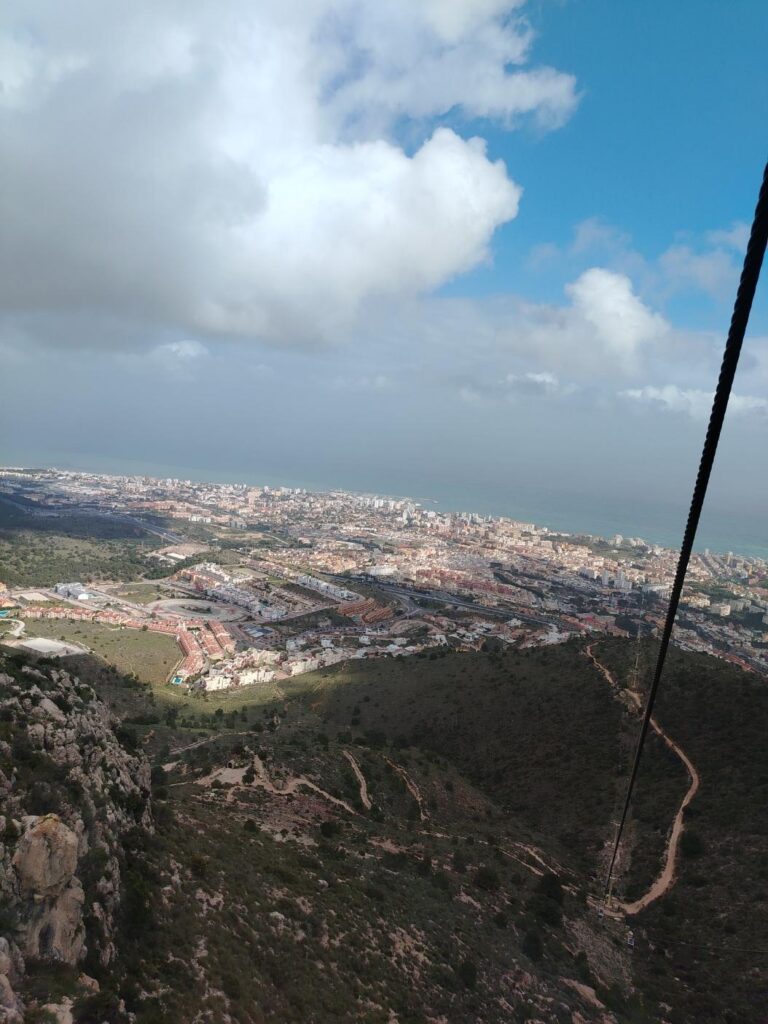 Ik besloot om naar het kabelbaanstation te lopen, aangezien het bergafwaarts was en slechts 45 minuten verderop. Onderweg luisterde ik naar het laatste uur van het audioboek waar ik tijdens mijn verblijf in Spanje naar had geluisterd. Het heet “The Art of Not Giving a F*ck”. Het is een zelfbenoemd zelfhulpboek, maar het biedt een heel ander perspectief op het leven. Het heeft me een aantal echt waardevolle dingen geleerd en ik heb het gevoel dat ik mijn opvattingen en waarden in het leven enigszins heb veranderd. Hoe dan ook, zoals altijd was ik de eerste die bij het kabelbaanstation aankwam. Ik heb ongeveer 20 minuten gewacht tot de rest er was, maar sommige mensen zouden een uur te laat komen, dus helaas moesten we zonder hen gaan. Het was een behoorlijk schilderachtige rit naar de top en toen we aankwamen, waren sommigen van ons al boven, omdat ze ervoor hadden gekozen om de hele berg te voet te beklimmen.