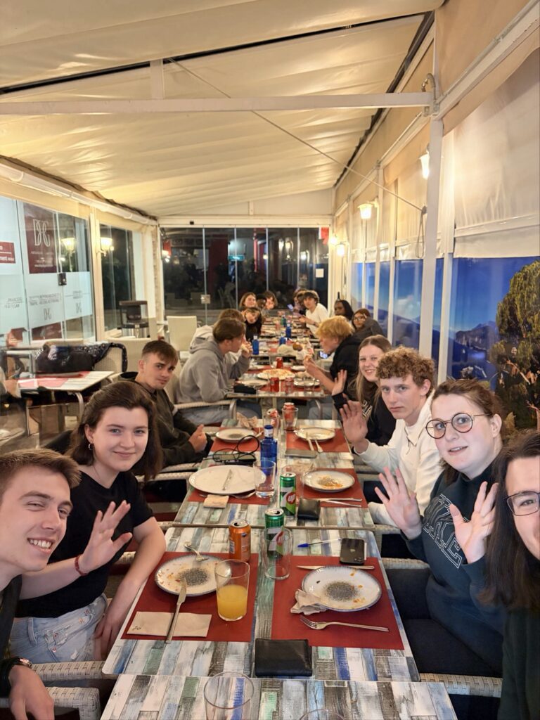Rond 5 uur namen we de trein terug en gingen we even rusten op de kamer. ’s Avonds, om 7 uur, hadden we met de hele groep afgesproken om te gaan eten bij Caruso. Daar hebben we genoten van verschillende pizza’s met allerlei smaken.